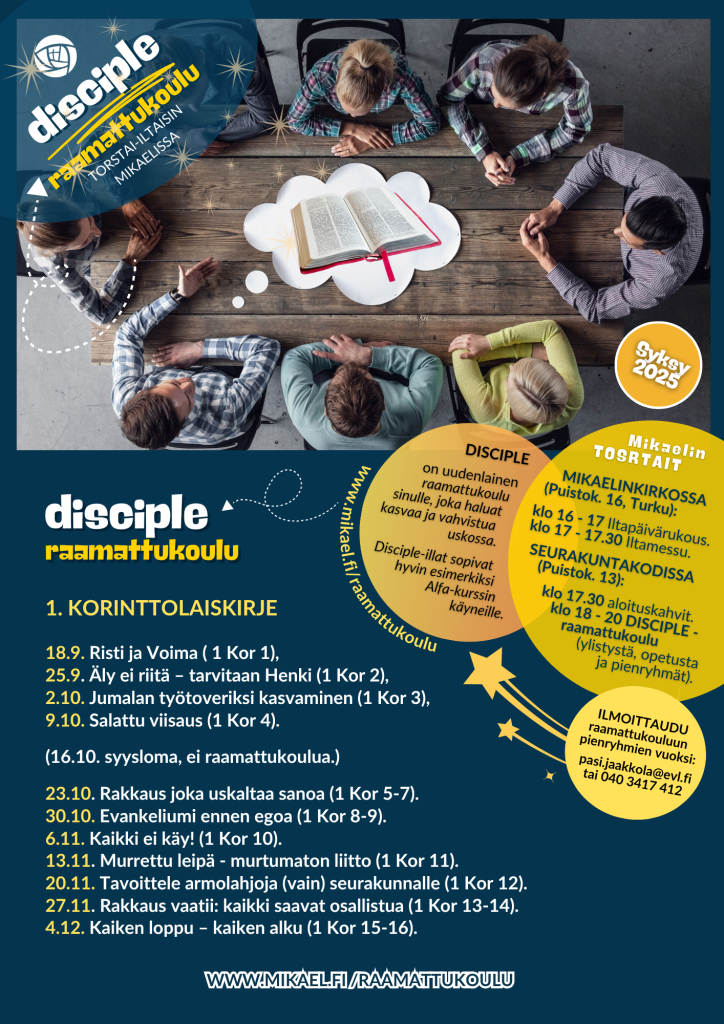 DISCIPLE on paikka pohtia suuria kysymyksiä, iloita pienistä oivalluksista ja etsiä omaa paikkaa Jumalan suunnitelmassa – tulevana syksynä 1. Korinttolaiskirjeen äärellä. Opetus on monipuolista ja syvällistä, mutta helposti lähestyttävää, ja jokainen ilta tuo mukanaan vaihtuvia opettajia sekä oman pienryhmäsi tuen. Olitpa juuri päättänyt