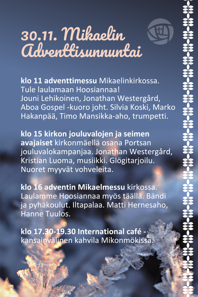 Mikael seurakuntayhtymän tapahtumakalenterissa. Linkki avautuu uuteen ikkunaan.